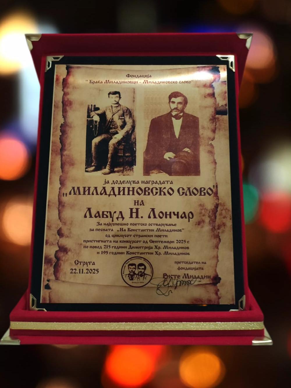 „Braća Miladinovci vode porijeklo iz grnčarske – lončarske porodice, pa sam i sam osjetio tu simboličnu vezu sa svojim prezimenom, te sam u jednom dahu napisao pjesmu inspirisan njihovim bogatim biografijama i životom. Zahvaljujem se direktnim potomcima ove velike porodice i Fondaciji ‘Miladinovci’ na dodjeli ovog laskavog priznanja. Struga je bila i ostaje stecište pjesnika i umjetnika, mjesto kojem se uvijek rado vraćam na njihove festivale. Nadam se da ćemo naredne godine realizovati davno započeti projekat zajedničke knjige poezije, koja je već u pripremi i za koju su autori izabrani, a koju stvaramo zajedno sa pjesnicima iz Makedonije i Crne Gore“, poručio je Labud N. Lončar povodom dobijanja ovog veoma vrijednog priznanja.