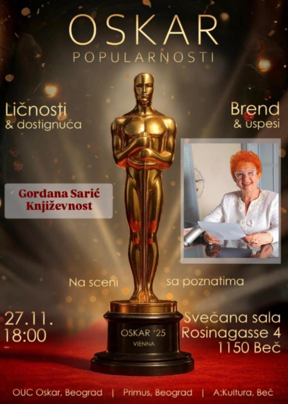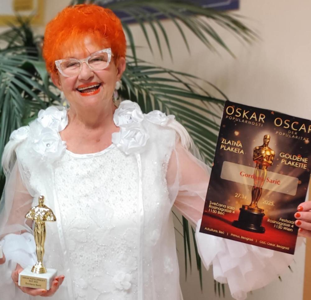U prepunoj svečanoj sali Magistrata u Beču, poznata crnogorska pjesnikinja Gordana Sarić nagrađena je prestižnim priznanjem Oskar popularnosti.