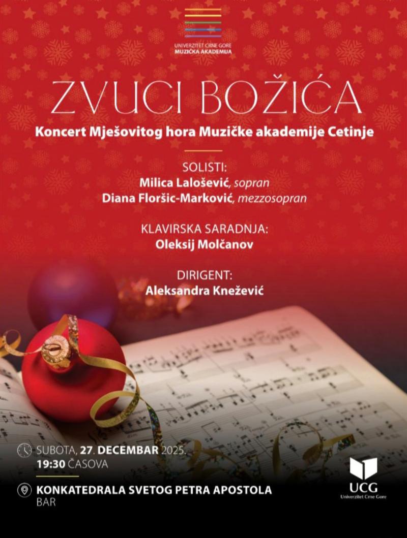 Univerzitet Crne Gore – Muzička akademija organizuje svečani božićni koncert pod nazivom „Zvuci Božića“, koji će biti održan u subotu, 27. decembra 2025. godine, sa početkom u 19.30 časova, u Konkatedrali Svetog Petra Apostola u Baru.