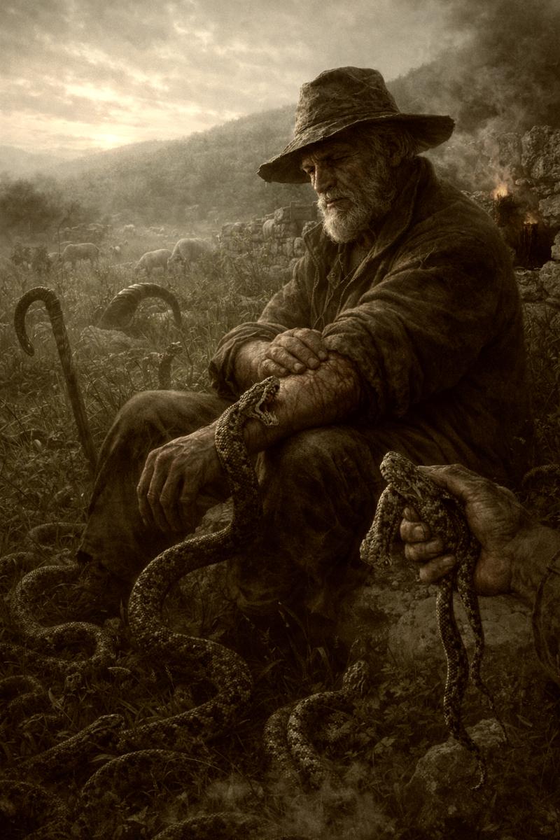 Volio je zmije. Ne onako kako se voli rijetkost ili čudo, nego mirno, prirodno, kao što se voli ognjište koje grije i hljeb ispod sača kad se lomi rukama. Držao ih je u kući. Spavao je u istoj prostoriji sa njima, gdje su se noću presijavale njihove kože. Kažu da je znao da ih dozove. Ne glasom, ne pokretom — samo prisustvom. I one bi dolazile, iz trave, iz pukotina, ispod kamenja.